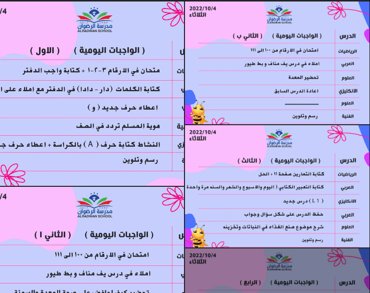 جدول الواجبات ليومية لجميع للصفوف........الاول......الثاني.....