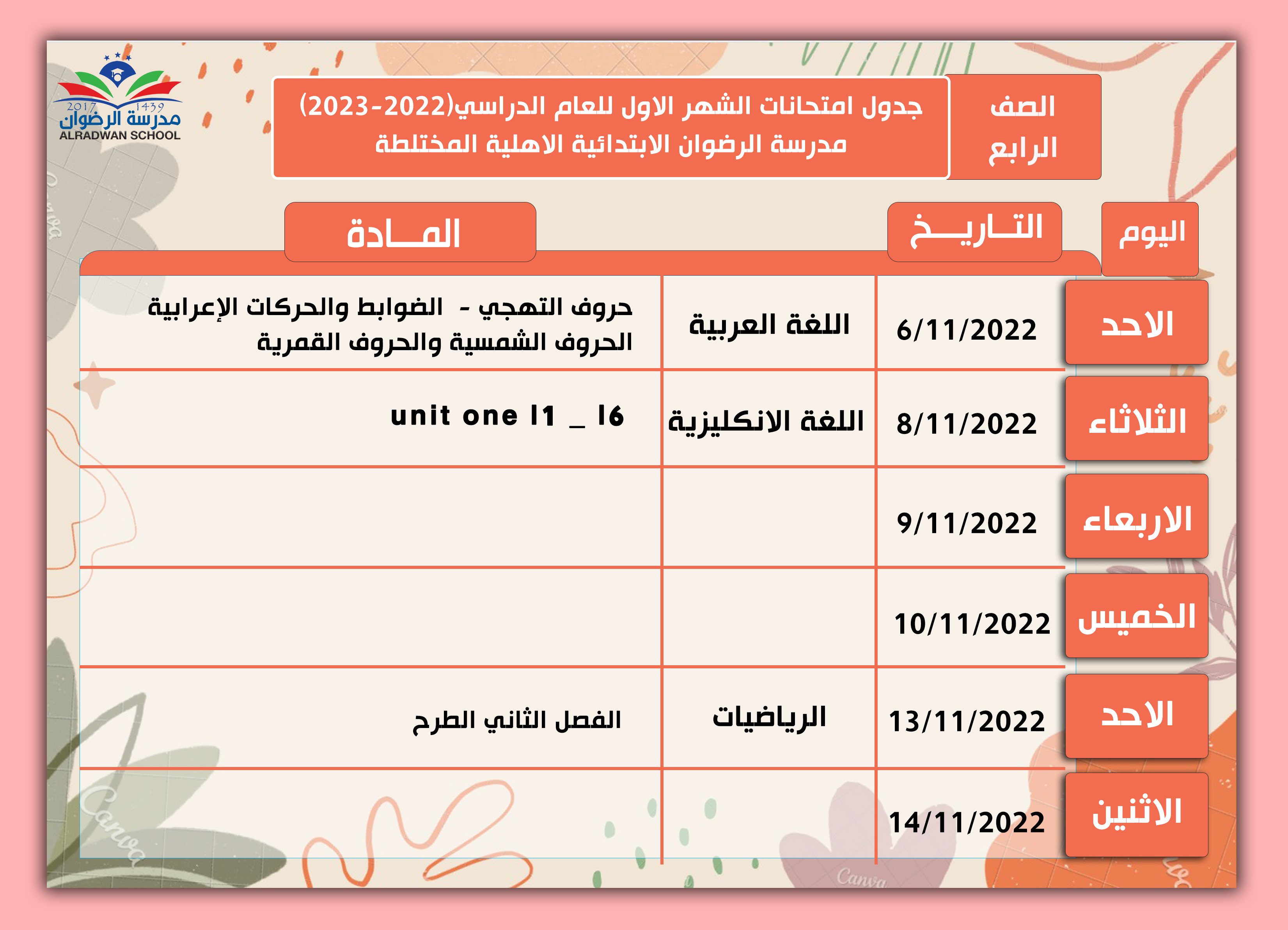 جدول امتحان الشهر الاول