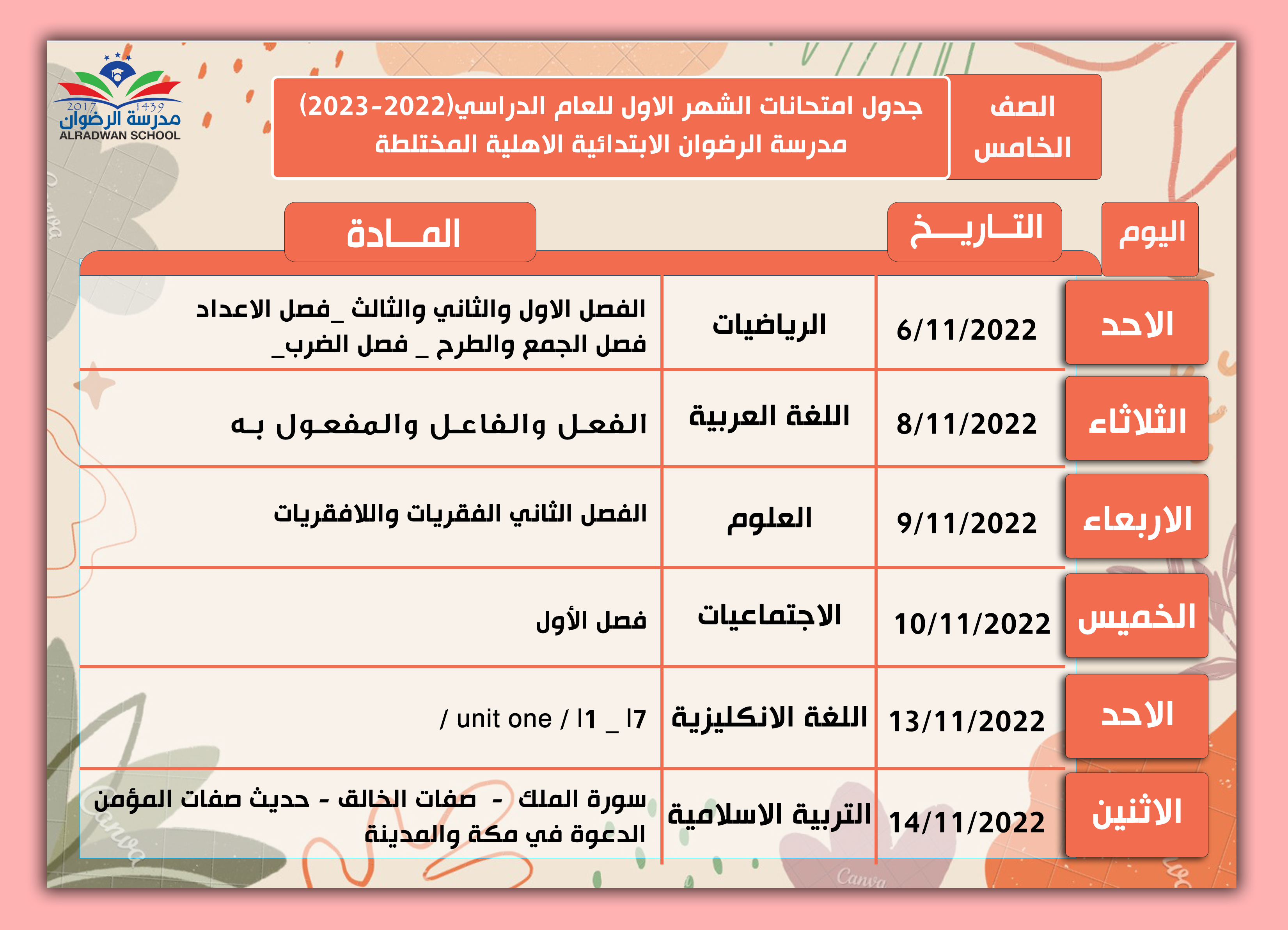 جدول امتحانات الشهرية الصف الخامس والسادس